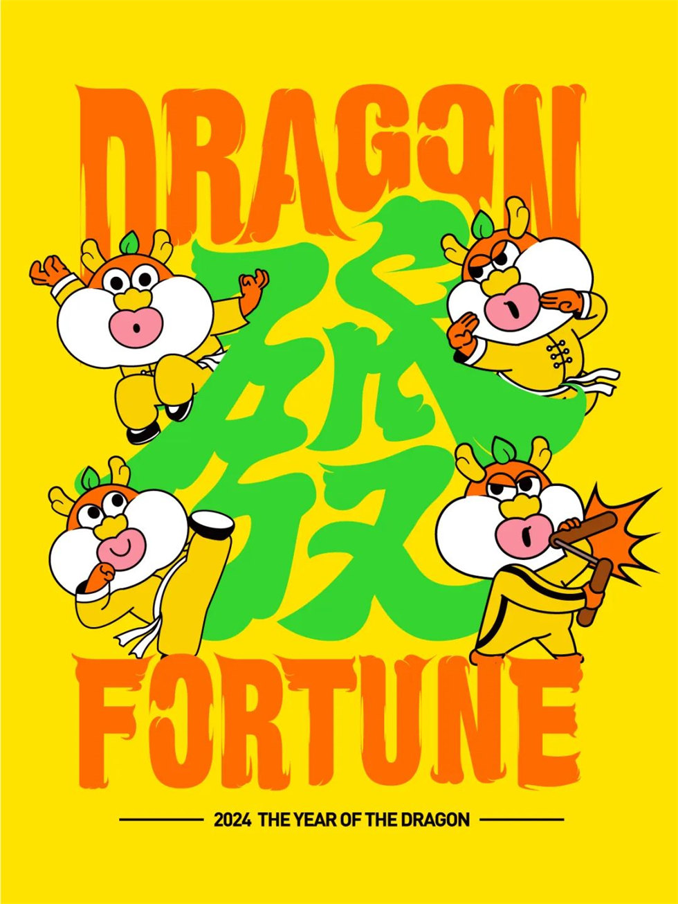 果然靈活的還得看胖子,肥嘟嘟的橙龍IP設(shè)計(jì)形象打氣功夫來別有趣味感,老香港功夫片的味道立刻出來了。新年一眾紅中,蹦出個(gè)耍雙截棍,高抬腿的黃色緊身衣的橙龍,那畫面絕對搶眼!希望快點(diǎn)能看到功夫橙龍主題的美陳設(shè)計(jì)出現(xiàn)!